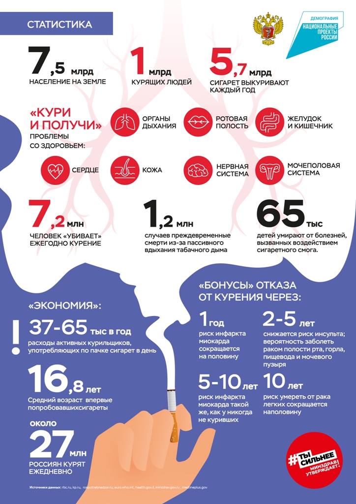 Опросы показывают, что три четверти россиян боятся заболеть раком. При этом курение вызывает более 22 видов рака и увеличивает риск развития онкопатологии легкого более чем в пятнадцать раз. По данным аналитического доклада FinExpertiza (основанного на данных Росстата) в 2022 году в России курило 22,99 млн человек (19,2% населения старше 15 лет).